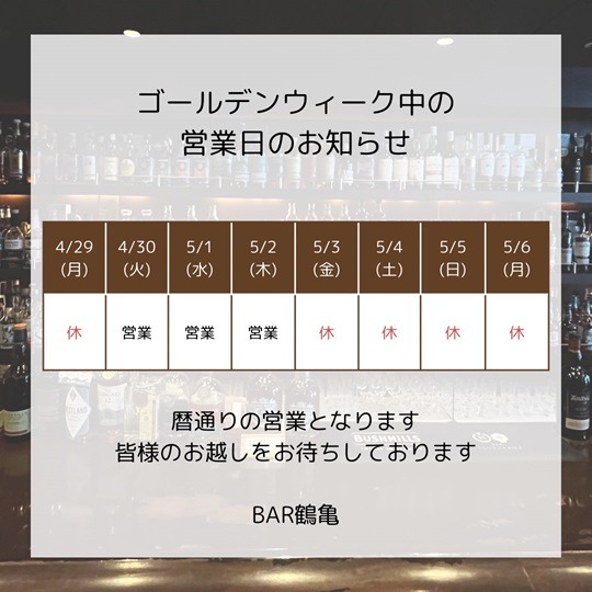 ゴールデンウィーク中の営業日のお知らせ | BAR鶴亀BASE店